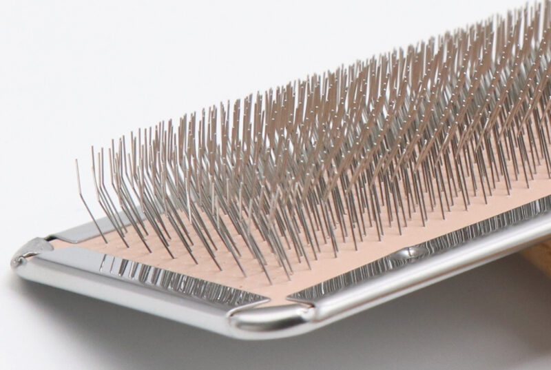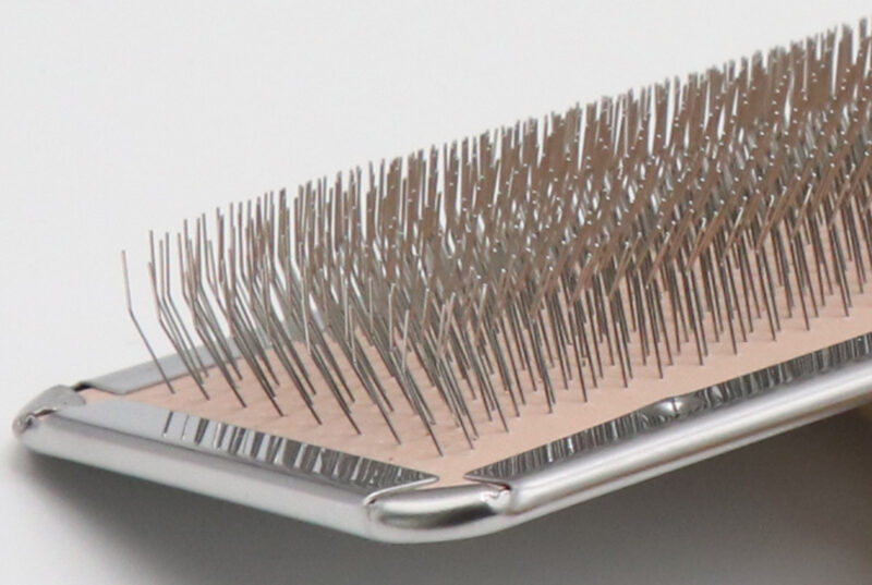 一般的なソフトスリッカーよりもさらに硬めに設計し、ピンの弾力をあえて抑えることで、密集したピンがしっかりと被毛をとらえます。